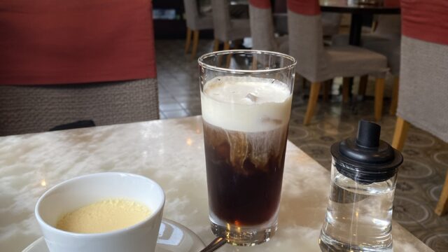ここでコーヒーとタルトが到着!まずはコーヒー。酸味はあるが苦みは控えめ。アイスなのも相まって飲みやすい。香りは何か独特で(表現力不足)とてもさっぱり