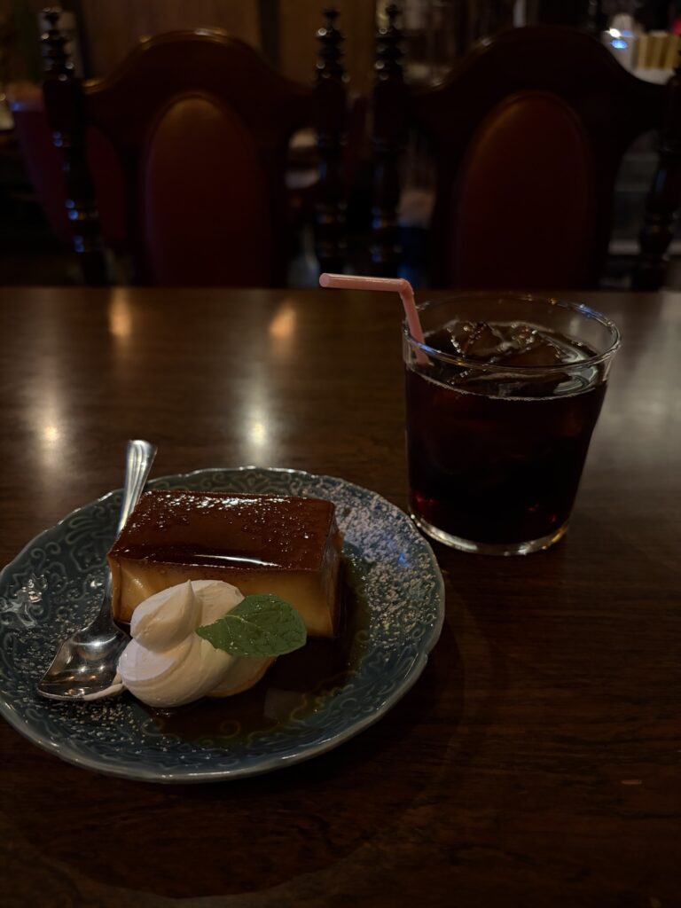 注文したのはブレンド深煎りのアイス(660)と喫茶店の固めのプリン(660)セット割りで1220円