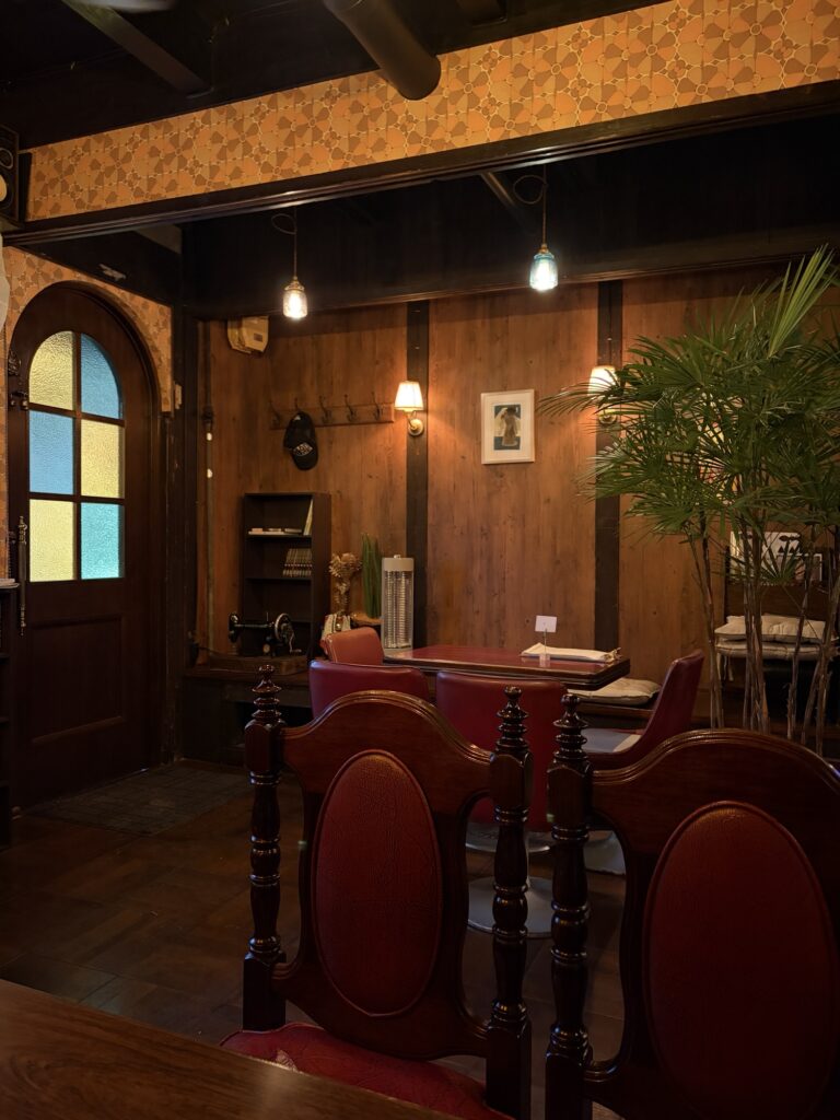 手前の空間(上の写真)は純喫茶の雰囲気であるが、奥の空間はバーのような雰囲気。壁にグラスやお酒、食器類などが並べられシャレたキッチンカウンターがある