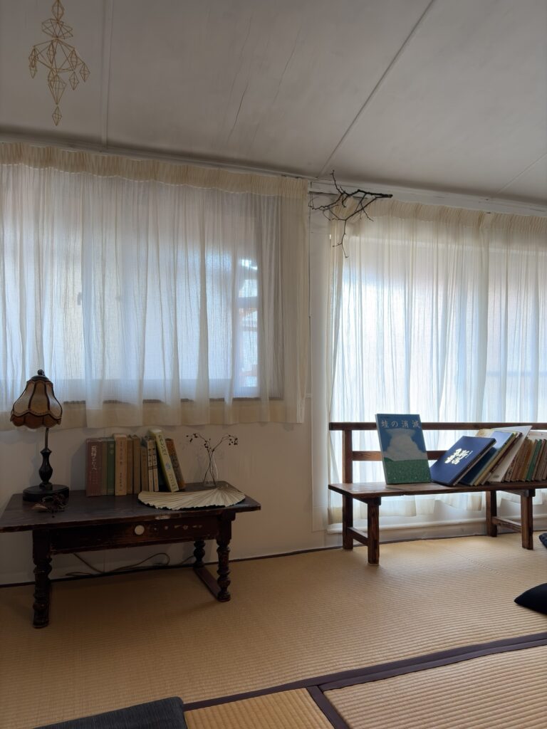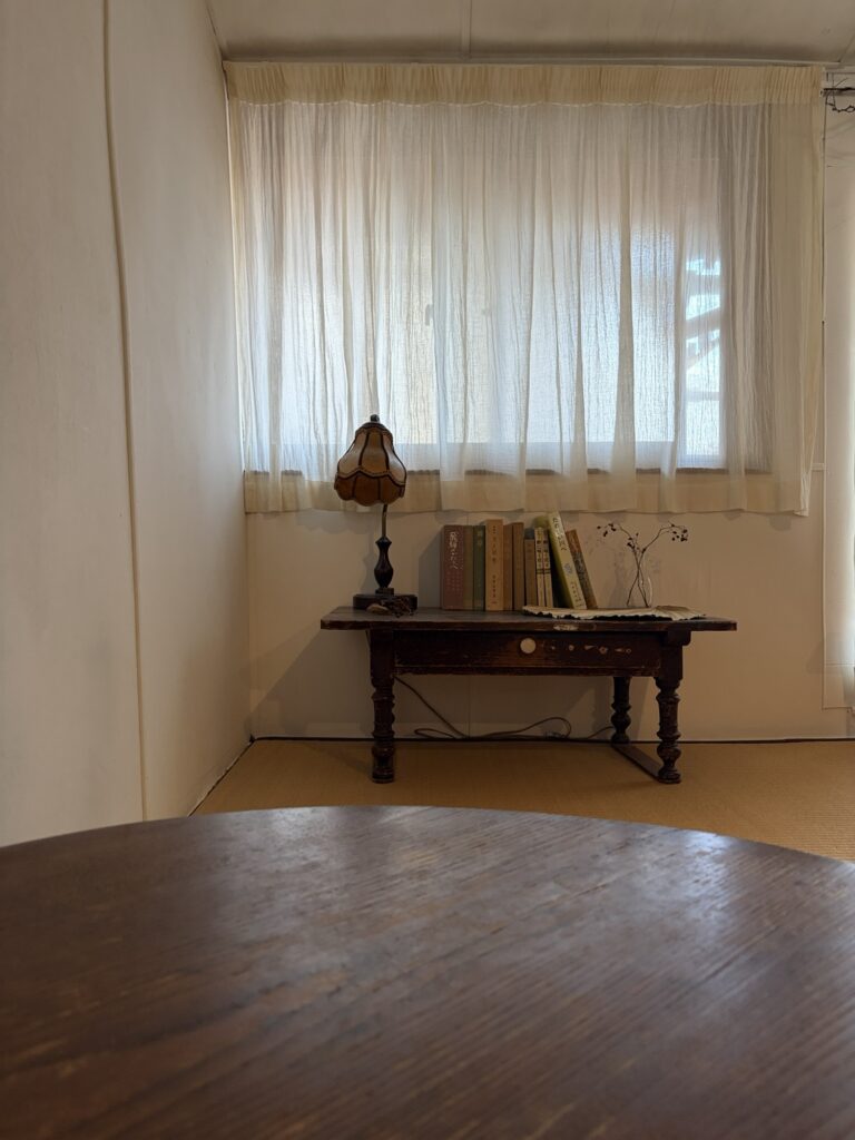照明は少ないですが、カーテン越しに窓から入る光だけでもほの明るく、モダンではあるけど和の落ち着きがある