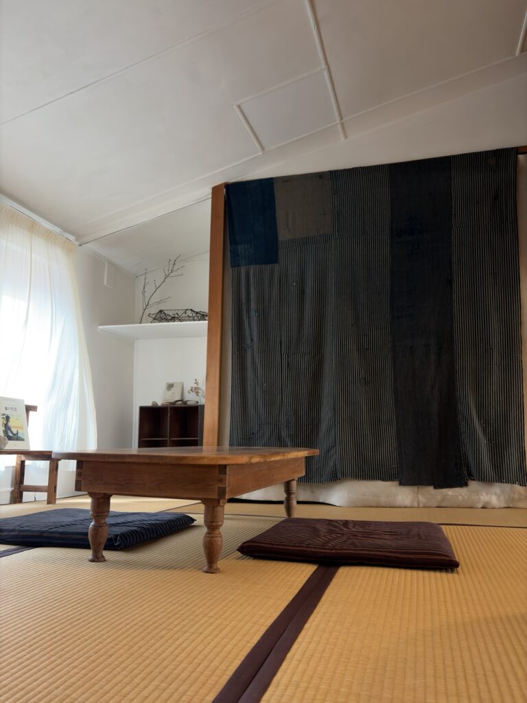 土間で靴を脱ぎ、人んちって雰囲気の1階を抜け階段を上がり2階へ。隅の席が空いてるとのこと