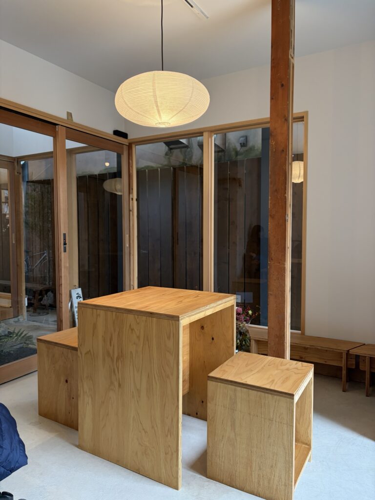 店内は手前のお茶するスペースと、廊下を挟んだレジカウンターとキッチンとのスペースに分かれている