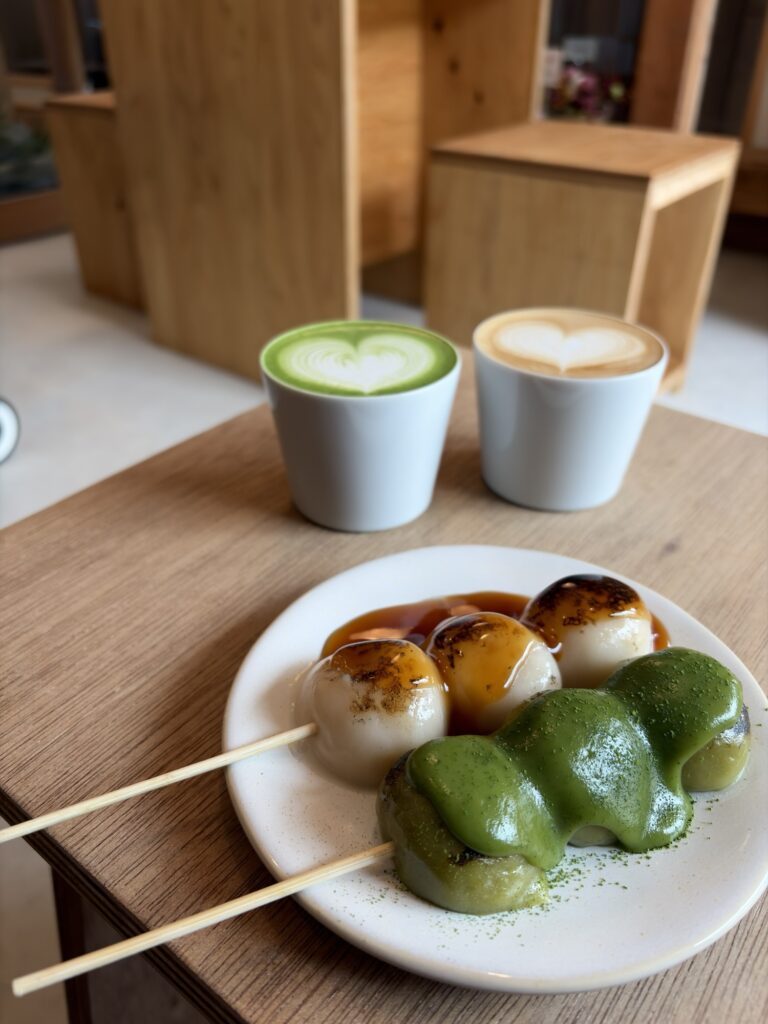 注文したのはカフェラテ(600)とみたらしと抹茶みたらし(1050)。インスタで見ていたので即決しました