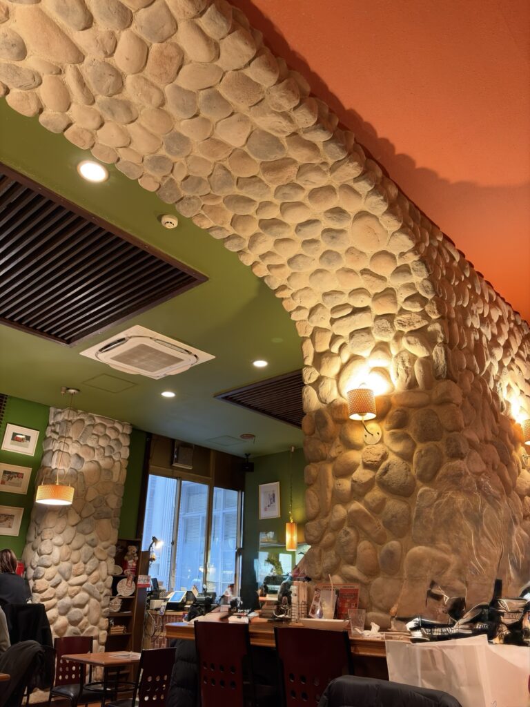 窓が少なくオレンジの照明が採用されており、ごつごつとした岩で装飾された柱も相まって、どこか地下空間のようでもある