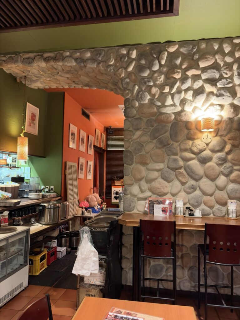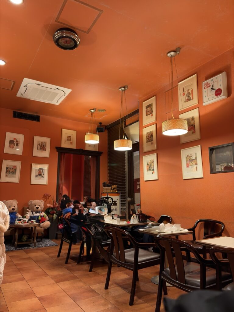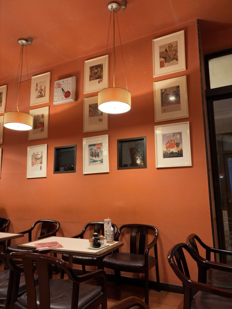 店内には至る所に絵が配置されていたり、壁や天井がオレンジやミドリに塗られているおかげで、レトロでありつつモダンな店内となっている