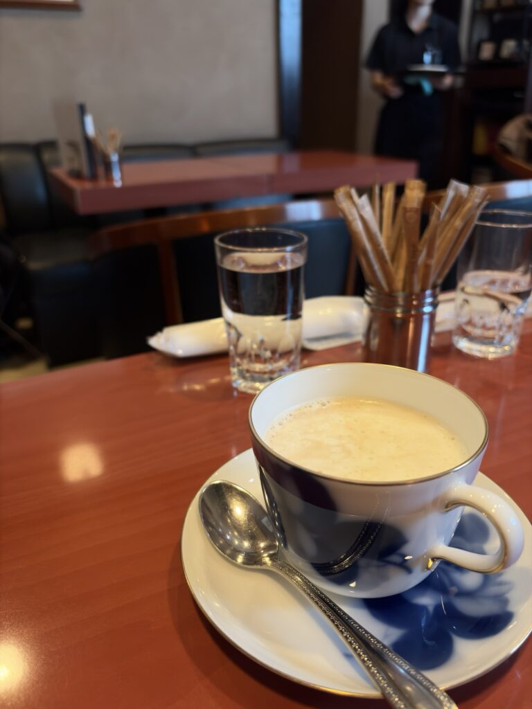 カフェオレが到着!スチームドミルクなんだ。では一口